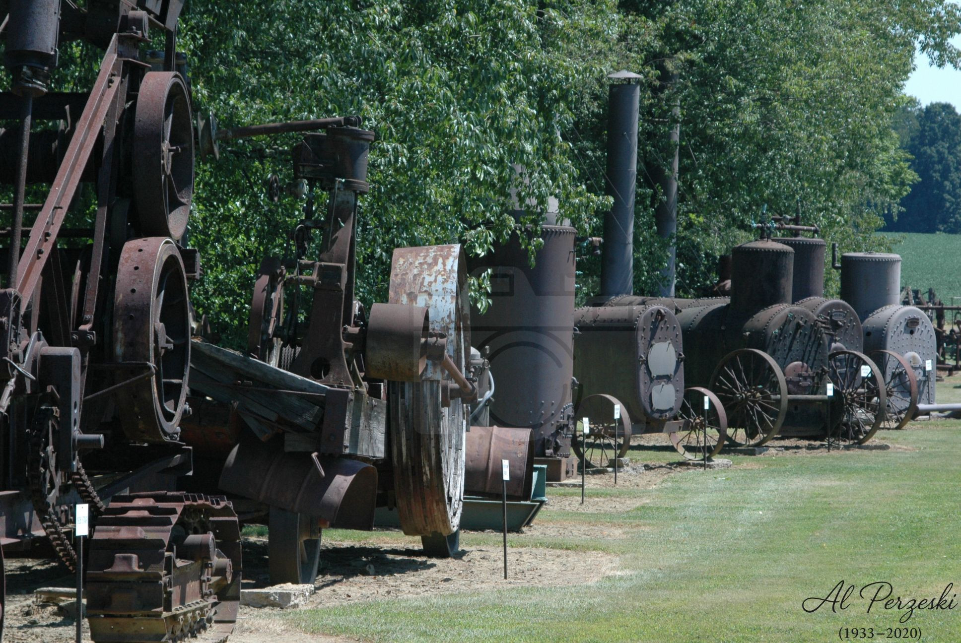 A row of rusted, heavy machinery and steam-powered engines stand motionless beneath summer trees—once industrious, now silent. The photograph captures the passage of time in layers of iron, wood, and history, inviting us to remember the hands that built and operated them.