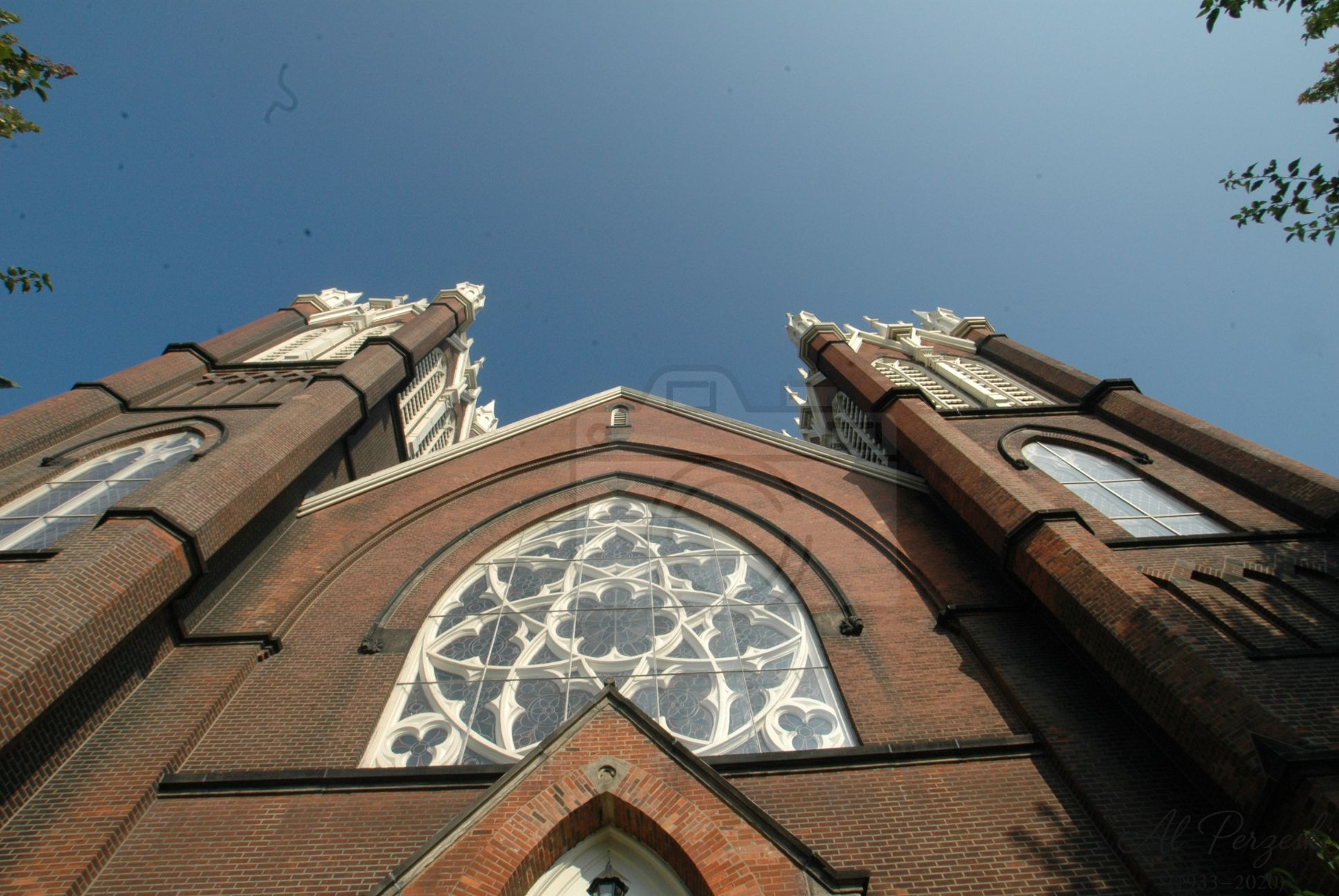 A glance toward the divine—brick, glass, and sky in perfect harmony.
