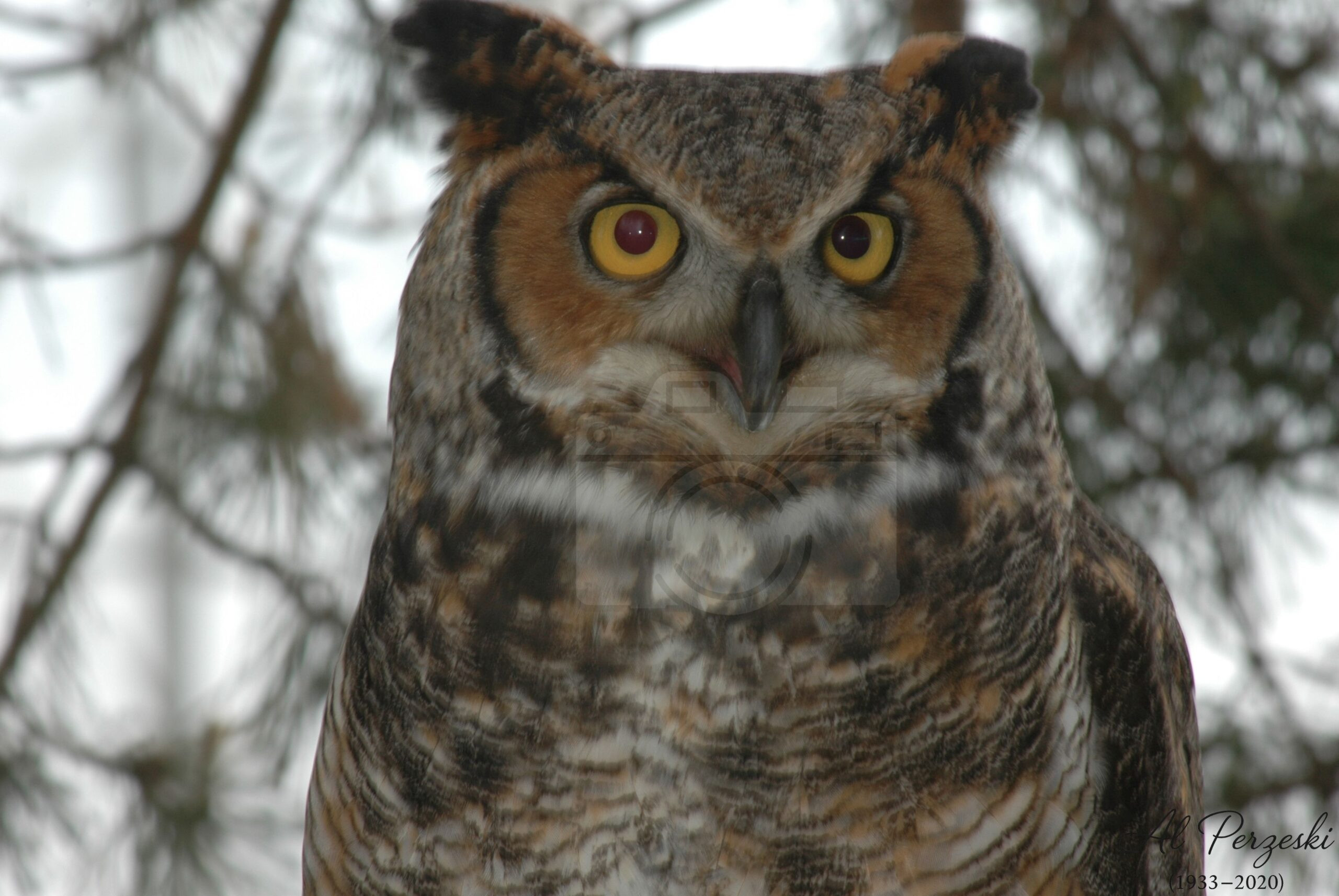 Staring straight through the lens—and into you. The Great Horned Owl, bold and alert, wears the wisdom of centuries in its golden eyes. A still guardian of the woods, captured in a single breath of winter.